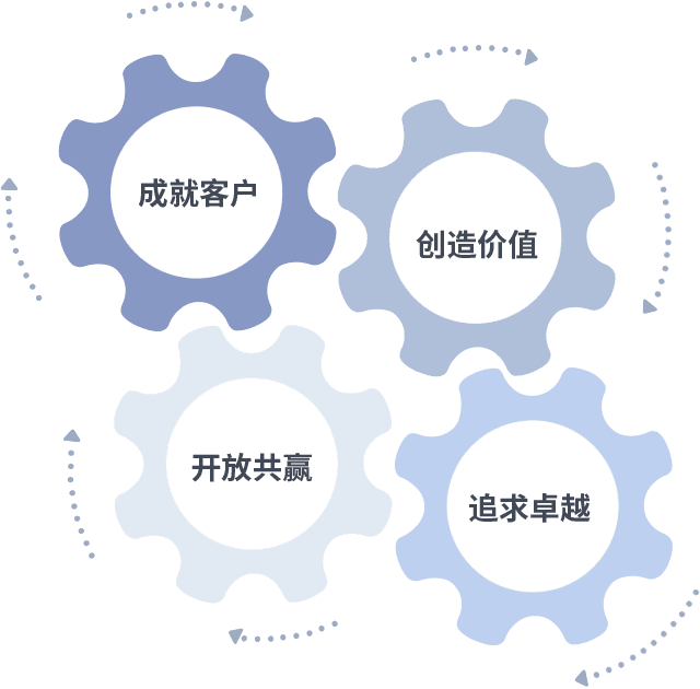 成就客户是一切决策的出发点,,,创造价值是衡量所有工作的标准,,,,追求卓越是我们做事做人的态度,,,,开放共赢是我们的格局也是最终的结果。。价值观的齿轮环环相扣,,,推动着组织里的每个人不断向前。。。。